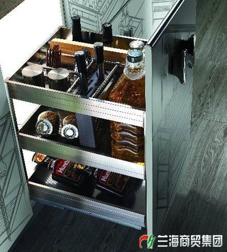 调味拉篮常常被做成抽屉式或缝隙式。缝隙式的拉篮可以说是把橱柜的空间利用率提到最高。如果是抽屉式的隔断,一般采用的是类似塑料的材质或不锈钢,不过塑料是不同于一般塑料,环保级别能达到食品级的。